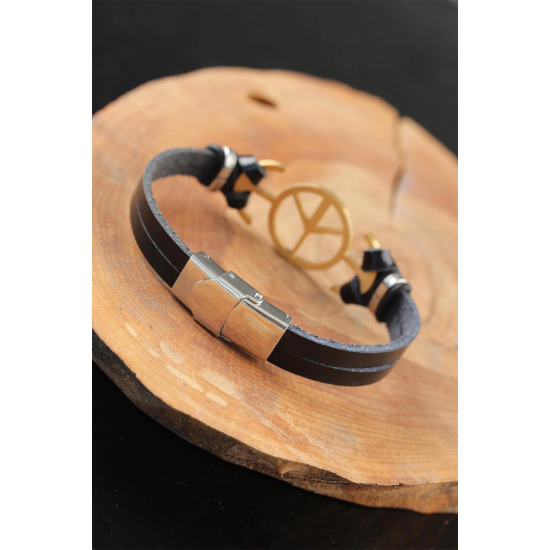 Kombinlerinizi Gold Renk Barış Figürlü Metal Aksesuarlı Siyah Renk Deri Erkek Bileklik ile şıklığa ulaştırın.
