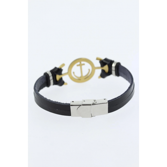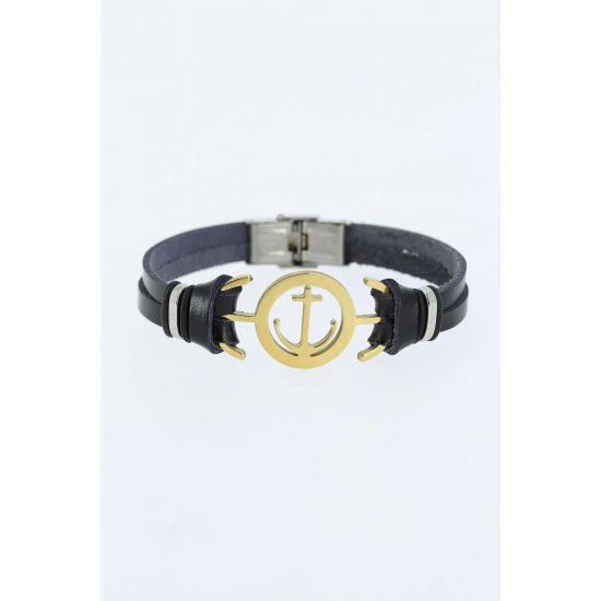 Mey İthalat® Gold Renk Deniz Çapası Figürlü Metal Aksesuarlı Siyah Renk Deri Erkek Bileklik