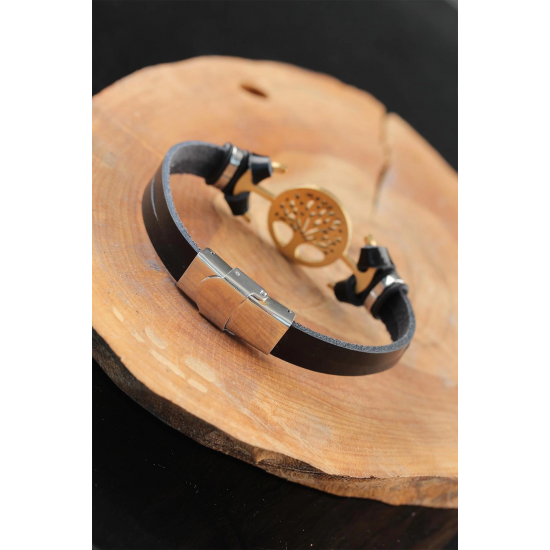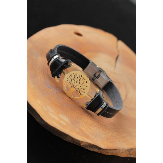Mey İthalat® Gold Renk Metal Ağaçlı Tasarım Siyah Renk Deri Erkek Bileklik