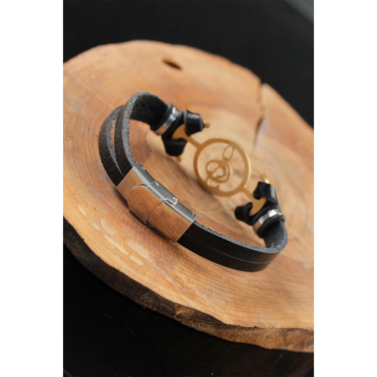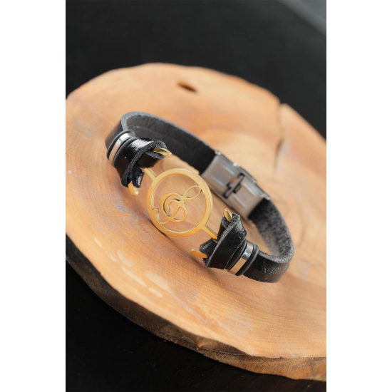 Mey İthalat® Gold Renk Metal Sol Anahtarlı Tasarım Siyah Renk Deri Erkek Bileklik
