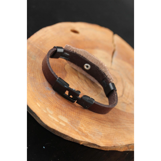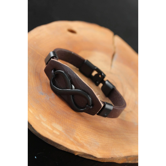Mey İthalat® Siyah Sonsuzluklu Metal Aksesuarlı Kahverengi Deri Erkek Bileklik