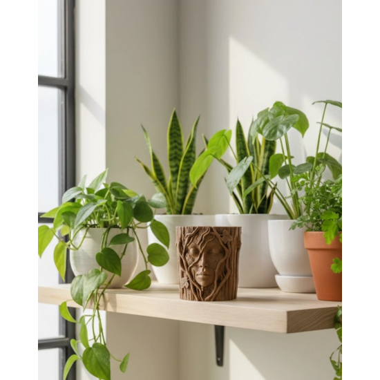 Doğanın zarafetini heykelsi bir formda sunan bu özel tasarım saksı, dekorasyonunuza karakter kazandırmak için tasarlanmıştır. Ağaç dokusu üzerine işlenmiş sakin yüz ifadesi, huzur ve dinginliği simgeler. Sarmaşıkların yüzü sarmalayan detaylı yapısı ürüne masalsı bir hava katmaktadır.Toprak tonlarının sıcaklığı mekâna doğal bir ambiyans sunarken, üç boyutlu kabartmalar premium bir görünüm sağlar. Minimal alanlarda bile güçlü bir dekoratif etki yaratır. Hem ev hem ofis ortamında dikkat çekici bir aksesuar olarak öne çıkar.