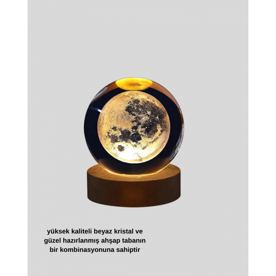 Ay Küre Gece Lambası, modern yaşam alanlarına hem estetik hem de işlevsel bir dokunuş ekleyen özel bir dekorasyon ürünüdür. Yüksek kaliteli beyaz kristal ile üretilmiş küre, içindeki ay figürünün tüm detaylarını olağanüstü bir netlikte sergiler. 3D lazer oyma teknolojisi ile işlenen ay yüzeyi, gerçek ayın kraterlerini andıran derinlik ve gölge efektleri sunarak adeta küçük bir gökyüzü parçası gibi görünür.Lambanın alt kısmında yer alan doğal ahşap stand, kristalin parlaklığı ile mükemmel bir uyum oluşturur. Ahşap malzemenin sıcak dokusu, kristal kürenin modern çizgilerini dengeler ve ürünü hem minimalist hem de doğal dekorasyon tarzları ile uyumlu hale getirir. Standın 7 cm çapı, kristal küreyi güvenle taşıyacak şekilde tasarlanmıştır ve 2 cm yüksekliği, ürünün bütünlüğünü estetik bir şekilde tamamlar. Kürenin 8 cm çapı ise hem dikkat çekici hem de kompakt bir görünüm sağlar.Ürünün en dikkat çekici özelliklerinden biri, yayılan sıcak ışığın oluşturduğu büyüleyici atmosferdir. LED ışık teknolojisi sayesinde enerji tasarrufu sağlar, aynı zamanda uzun ömürlüdür. Işık göz yormaz ve özellikle dinlenme, meditasyon, uykuya hazırlık gibi anlarda sakinleştirici bir etki yaratır. Bu nedenle yatak odası, salon, çalışma odası veya ofis masası gibi alanlarda kullanım için mükemmeldir.USB bağlantılı pratik yapısı, gece lambasını son derece kolay kullanılır hale getirir. Düğme ya da karmaşık kontrol ihtiyacı sunmaz; fişi takmanız ışığın yanması için yeterlidir. Çıkardığınızda kapanır. Basit, güvenli ve modern bir kullanım sunar.Ay temalı kristal küre, sevdiklerine anlamlı bir hediye arayanlar için ideal bir seçenektir. Hem dekoratif obje hem de gece lambası olarak kullanılabilir, bu da ürünü çok yönlü ve her ortama uyumlu bir hediye haline getirir.