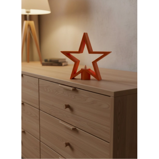 Yıldız formundaki turuncu mumluk, sade tasarımıyla dikkat çekerken rengiyle ortama canlılık katar. Akşam saatlerinde mum ışığıyla birleşerek sıcak ve rahatlatıcı bir ortam oluşturur. Minimal, bohem ve modern dekorasyon stilleriyle uyumlu yapısı sayesinde evin farklı alanlarında rahatlıkla kullanılabilir.
