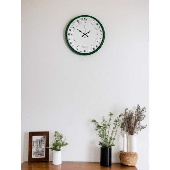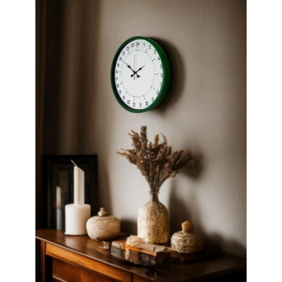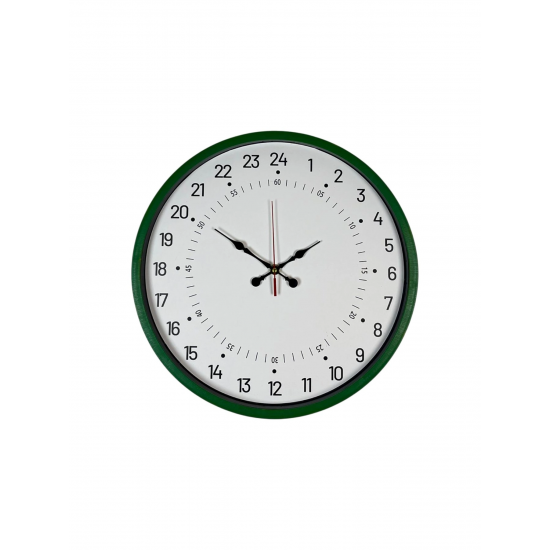 Yeşil çerçevesi ve sade beyaz kadranıyla tasarlanan bu 36 cm duvar saati, 24 saatlik (1–24) zaman gösterimi sayesinde klasik duvar saatlerinden ayrılır. Günün tüm saatlerini tek kadranda net şekilde sunarak özellikle vardiyalı çalışma düzeni olan alanlarda ve zamanı daha bilinçli takip etmek isteyen kullanıcılar için ideal bir kullanım sağlar.