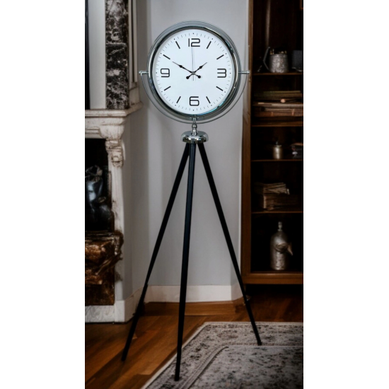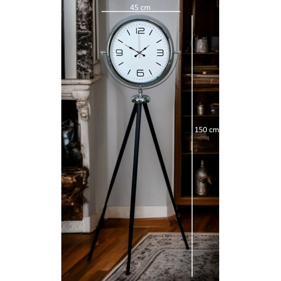 Modern tasarımı, dengeli duruşu ve zamansız şıklığıyla öne çıkan bu krom tripod ayaklı saat, klasik saat modellerinden farklı olarak yalnızca zamanı göstermekle kalmaz; bulunduğu mekâna güçlü bir dekoratif etki kazandırır. 150 cm yüksekliği ve 45 cm genişliği sayesinde geniş alanlarda dikkat çeken bir odak noktası oluşturur ve dekorasyonun merkezinde yer alır.