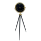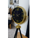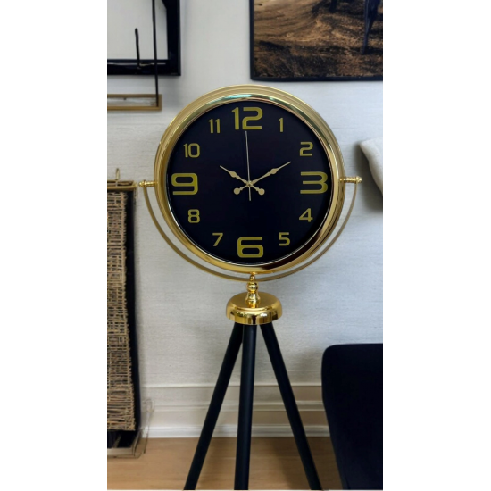 Gold metal çerçevesi ile derin siyah kadranın uyumu, lüks ve modern dekorasyon anlayışını yansıtırken; siyah tripod ayak yapısı saate dengeli, sağlam ve estetik bir görünüm kazandırır. İnce detaylarla tasarlanmış geniş kadranı sayesinde saat, uzaktan dahi rahatlıkla okunabilir.