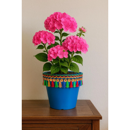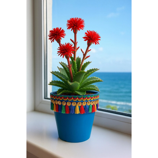 Yükseklik 15 cm ?Evinize pozitif enerji ve renk katacak dekoratif plastik saksıCanlı Renkleriyle göz alıcı bir atmosfer oluşturur.; Saksının çevresinde yer alan renkli püsküller ve altın detaylı el işçiliği, yaşam alanınıza enerjik bir dokunuş katar.; •Ham maddesi UV ışınlarına dayanıklıdır, iç ve dış mekanda uzun zaman kullanılabilir•Birbirinden farklı renkleriyle tüm mekanlara uyum sağlar•Küçük boy çiçek ve bitkiler için idealdir•İçindeki siyah süzek, fazla suyu topraktan ayrılır•Zemininde su tahliye deliği bulunur•Altlığı sayesinde temiz kullanım sağlar•Kolay temizlenir•Yaklaşık 16 cm çapındadır•1,7 lt hacmi vardır•Salon, bahçe, balkon, ofis vb yerlerde kullanılabilir•İçerisindeki bitkiler bir başka saksıya kolaylıkla aktarılabilir? Kullanım Alanları:Pencere önü, balkon, konsol veya ofis köşelerinde dekoratif amaçlı kullanım için idealdir.; Renkli tasarımıyla Evinize mükemmel uyum sağlar.; ? Enerjisi yüksek, saksıyı sepetine ekle, yaşam alanına neşe kat!