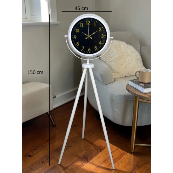 Modern ve lüks tasarımıyla dikkat çeken 150 x 45 cm beyaz ayaklı saat, siyah kadranı ve gold rakam detaylarıyla bulunduğu ortama güçlü bir karakter kazandırır. Yüksek kontrastlı tasarımı sayesinde hem şık bir dekorasyon ürünü hem de kolay okunabilir bir saat deneyimi sunar.