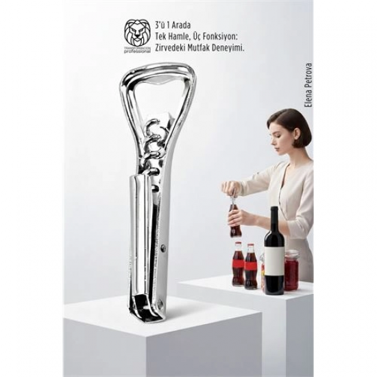 Mey İthalat® 3’ü 1 Arada Profesyonel Çelik Tirbüşon: Lüks Şişe ve Kavanoz Açacağı Kombine Set