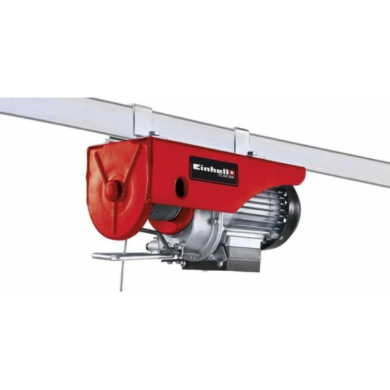 TC-EH 250 elektrikli vinç, sadece bir düğmeye basarak ev, bahçe ve atölye gibi her yerde yüklerin güvenli bir şekilde kaldırılmasını sağlar. Çok sayıda özelliği ile bu kablolu vinç en son teknolojiyi yansıtmaktadır. 3,2 mm kesitli 12 metrelik tel kablo, kılavuz makara ve yük kancasıyla birlikte maksimum 250 kg yükü 5,7 m yüksekliğe kaldırmak için kullanılabilir. Kılavuz makara olmadan maksimum yük yarıya düşer ancak kaldırma yüksekliği 11,5 m'ye çıkar.TC-EH 250 çok sayıda güvenlik özelliğine sahiptir. Tamamen yalıtılmış bir AÇMA anahtarı, vinci derhal durduran bir acil KAPATMA işlevine sahiptir. Sağlam motor, termostatik bir anahtarla aşırı ısınmaya karşı korunur. Bükülmeyen tel kablo, yükün kaldırılırken bükülmesini önler. Yük kancasındaki emniyet mandalı yükün istenmeden düşmesini önlerken, otomatik fren yükü her pozisyonda sabitlemeye hazırdır. Son konumda güvenilir kapatma için pozitif olarak çalıştırılan, otomatik bir limit kesme vardır. Kablo vincini sabitlemek için iki çift kelepçe sağlanmıştır. TC-EH 250 için ayrı olarak, çok katlı binalarda yükleri daha yüksek seviyelere ve katlara kaldırmak için uygun bir döner kol mevcuttur.