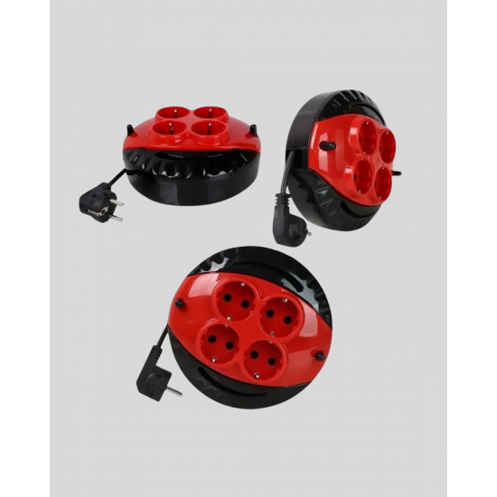 Mey İthalat® 3 Metre Uzatma Kablolu 4 Prizli Makara Kırmızı