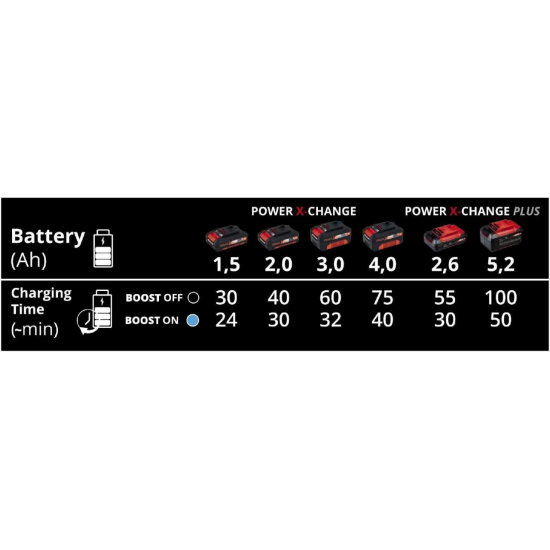 Power X-Change serisi aküler için 6 A'lik ultra hızlı şarj cihazı Power X-Boostcharger. Boostcharger şarj cihazı üzerindeki mod butonu ile çok kısa sürelerde PXC akünüzü şarj edebilirsiniz. Power X-Change serisindeki tüm cihazlar aynı tip akü ve şarj cihazı ile kullanılabildiği için zaman ve kaynak tasarrufu sağlayarak kullanıcıya büyük fayda sunarlar. Mikroişlemci teknolojisi ile akü şarj edilirken etkin olarak izlenerek aşırı şarj ve ısınmaya karşı tam koruma sağlanır. Şarj durumunun takibi için 6 kademe durum göstergesi vardır ve derin deşarj olan aküler tamir modunda şarj edilir. Şarj cihazını askı deliklerini kullanarak isterseniz duvara monte edebilirsiniz.