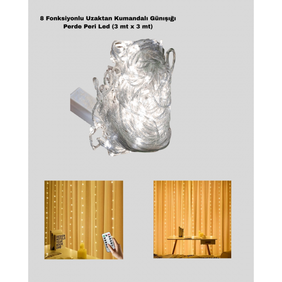 8 Fonksiyonlu Uzaktan Kumandalı Günışığı Perde Peri Led, yaşam alanlarınıza estetik, sıcak ve romantik bir atmosfer kazandırmak için tasarlanmış dekoratif bir aydınlatma çözümüdür. Özellikle doğum günü, nişan, söz, kına gecesi, evlilik teklifi, yıl dönümü gibi özel gün konseptlerinde mekânın havasını anında değiştiren bu ürün, aynı zamanda günlük kullanım için de son derece uygundur.Günışığı renk tonu sayesinde göz yormayan, yumuşak ve doğal bir aydınlatma sunar. Soğuk beyaz ışıkların aksine daha sıcak bir ambiyans oluşturur ve bulunduğu ortama huzurlu bir görünüm kazandırır. Perde tipi saçaklı yapısı, özellikle duvar, pencere, perde arkası, balkon, yatak başı ve fotoğraf köşeleri gibi alanlarda oldukça şık bir dekor oluşturur.Ürünle birlikte gelen uzaktan kumanda sayesinde 8 farklı ışık modu arasında kolayca geçiş yapılabilir. Sabit ışık, dalgalı geçişler, yavaş yanıp sönme gibi farklı animasyon seçenekleri ile ortama göre ışık ayarı yapılabilir. Kumanda üzerinde bulunan zamanlayıcı fonksiyonu sayesinde ürün 8 saat açık, 16 saat kapalı olacak şekilde otomatik olarak çalıştırılabilir. Bu özellik özellikle gece kullanımı için enerji tasarrufu sağlar.Parlaklık ayarı da kumanda üzerinden rahatlıkla kontrol edilebilir. + ve - tuşları ile ışık şiddeti azaltılabilir veya artırılabilir. Böylece loş bir ortamdan daha aydınlık bir atmosfere geçiş yapılabilir. USB bağlantı ile çalışması sayesinde adaptör, powerbank, bilgisayar veya TV USB girişlerinden kolayca enerji alınabilir.3 metre genişlik ve 3 metre yükseklik ölçüsüyle geniş alanları rahatlıkla kaplayabilen bu perde led, hem ev dekorasyonunda hem de organizasyon süslemelerinde pratik ve şık bir çözüm sunar. Hafif yapısı sayesinde kolay monte edilir ve istenildiğinde sökülerek tekrar kullanılabilir.