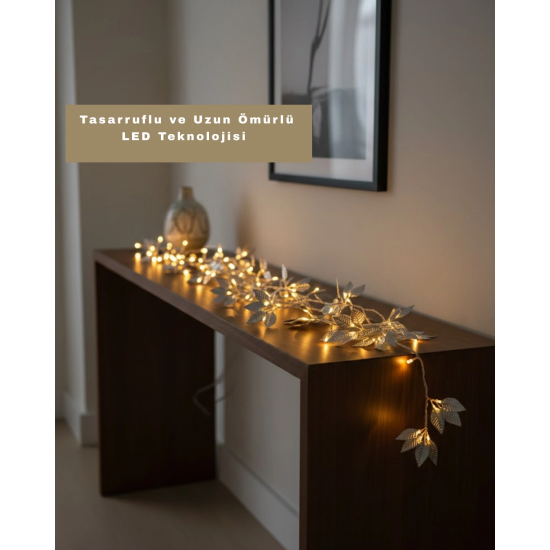 Yaprak şekilli gümüş LED ışık, ev dekorasyonunda estetik detaylara önem verenler için özel olarak üretilmiştir. İnce yaprak tasarımı, ürüne zarif bir görünüm kazandırır ve bulunduğu ortamda dikkat çekici bir atmosfer oluşturur.Pilli çalışma sistemi sayesinde elektrik bağlantısına gerek duymaz. Bu da ürünü raf, vitrin, masa, pencere ve duvar dekorasyonlarında kullanmayı oldukça kolaylaştırır. Kablo karmaşası olmadan temiz ve düzenli bir görünüm sunar.Sıcak LED ışığı, ortamın daha huzurlu ve davetkâr olmasını sağlar. Özellikle akşam saatlerinde evin genel ambiyansını yumuşatır. Yılbaşı ve özel gün dekorasyonlarında da sıklıkla tercih edilir.Gümüş tonları, modern dekorasyon stilleriyle uyum sağlarken klasik dekorlarda da şık bir tamamlayıcı olarak kullanılabilir. Ürün, açık veya kapalı haldeyken estetik görünümünü korur.Dekoratif gümüş yaprak LED ışık, hem günlük kullanım hem de özel günler için fonksiyonel ve şık bir aydınlatma çözümüdür.