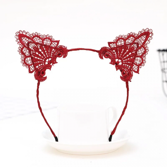 Mey İthalat® Dantelli Kırmızı Kedi Tacı - Vintage Tarz Dantel Kedi Kulak