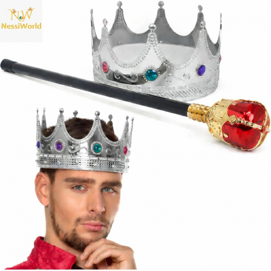 Mey İthalat® Gümüş Kral Tacı Kraliyet Tacı 60 cm ve Kırmızı Topuzlu Kral Asası Seti