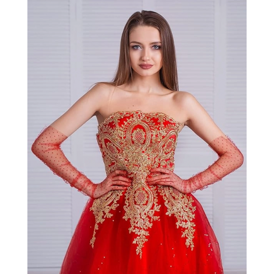 Uzun Boy Kırmızı Puantiyeli Kırmızı Renk Tül Eldiven