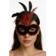 - Kırmızı dantel, siyah ve kırmızı tüyler ve siyah süet kaplama ile süslenmiş göz alıcı bir parti maskesi tasarımı.