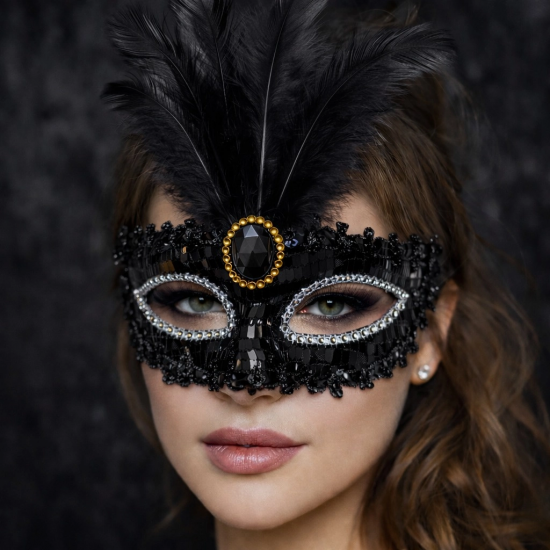 Mey İthalat® Lüks Siyah Tüylü Taşlı Balo Maskesi