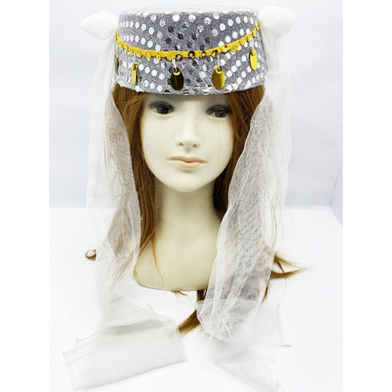 Mey İthalat® Beyaz Duvaklı Altın Pul İşlemeli Kına Fesi Kına Şapkası Oryantal Şapkası