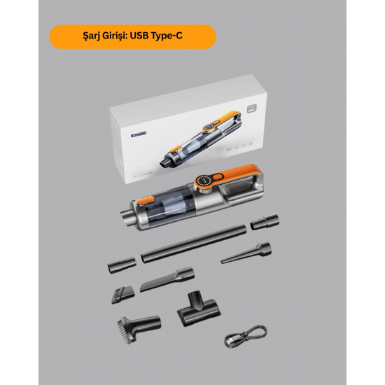 Bu kablosuz el süpürgesi, güçlü motoru sayesinde hem kuru hem sıvı kirleri etkili şekilde temizler. Toz, saç, kırıntı, evcil hayvan tüyü ve sıvı kalıntılarında yüksek performans sunar. Ürünle birlikte gönderilen numaratör hediyesi, düzenleme ve işaretleme ihtiyaçlarında kullanıcıya ekstra avantaj sağlar.USB Type-C ile hızlı şarj imkânı sunan cihaz, tam şarjla 25–30 dakika boyunca kesintisiz temizlik yapabilir. Kablo derdi olmadan kullanım sağlayan kablosuz yapısı, özellikle araç içi ve dar alan temizliklerinde büyük kolaylık sağlar.Set içerisinde bulunan 5 farklı başlık, farklı yüzeyler için özel olarak tasarlanmıştır. Dar uçlu başlık ince boşluklarda detaylı temizlik sunarken, geniş başlık zemin temizliğinde kullanılır. Fırçalı başlık hassas yüzeylerde idealdir; yuvarlak başlık köşe ve kenarlarda etkili sonuç verir. Esnek hortum ise cihazın erişemediği dar alanlara ulaşmayı sağlar.Yıkanabilir toz haznesi hijyenik kullanım sunar ve uzun süreli performans sağlar. Kompakt ve taşınabilir tasarımı sayesinde evde, araçta ve ofiste her zaman elinizin altında bulundurabileceğiniz bir temizlik yardımcısıdır.