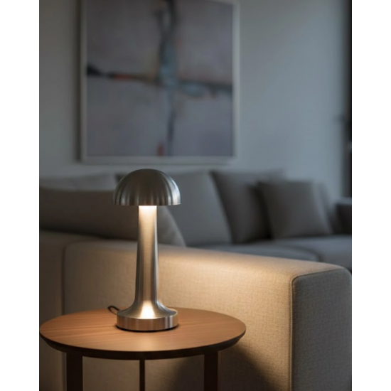 Mey İthalat® Dokunmatik Mantar Masa Lambası 3 Modlu Işık Şarjlı Kablosuz LED Krom Gövde