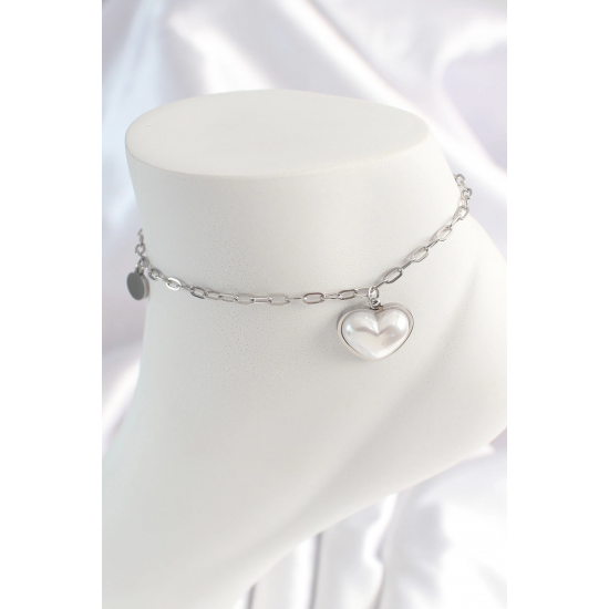 Mey İthalat® 316L Çelik Gümüş Renk Zincir Model 3D Kalp Beyaz Kalp Figür Kadın HalHal