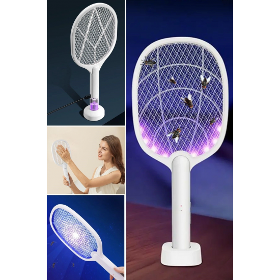 Şarjlı Sinek Öldürücü Masaüstü Standlı, Mor Işık Sinek Kovucu Raket 5W, sinek ve diğer uçan böceklerle mücadele için tasarlanmış etkili ve kullanışlı bir cihazdır. Şarj edilebilir bataryası ve masaüstü standı sayesinde pratik bir kullanım sunar.