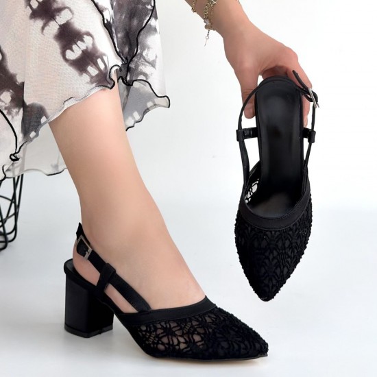Poje Siyah Saten Tül Detaylı Topuklu Ayakkabı