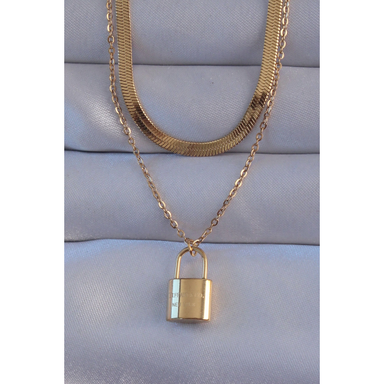Mey İthalat® 316L Çelik Gold Renk Çift Zincir Kilit Model Kolye