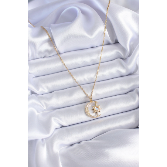 Mey İthalat® 316L Çelik Gold Renk Zirkon Taşlı Ay Yıldız Model Kadın Kolye