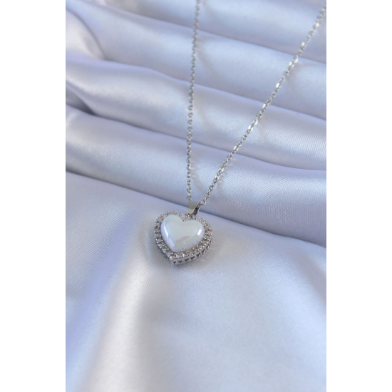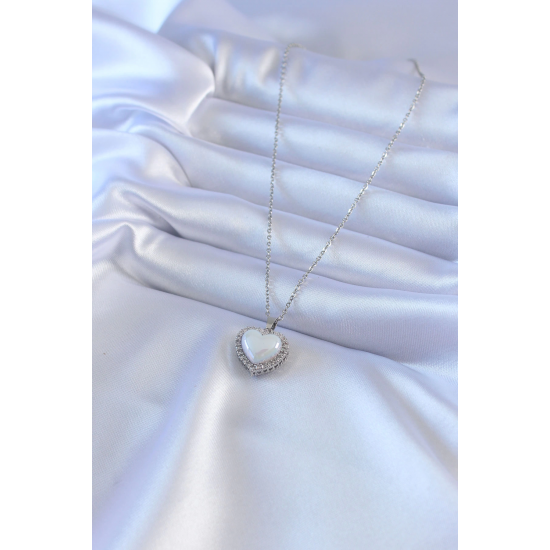 Mey İthalat® 316L Çelik Gümüş Renk İncili Kalp Model Zirkon Taşlı Kadın Kolye