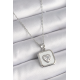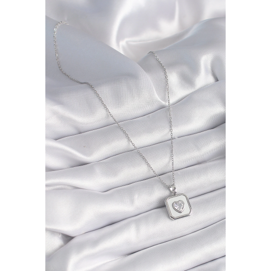 Mey İthalat® 316L Çelik Gümüş Renk Kare Madalyon Kalp Zirkon Taş İşleme Kadın Kolye
