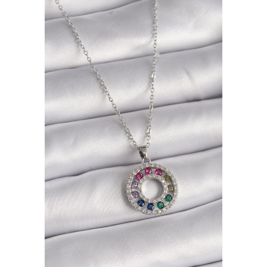 Mey İthalat® 316L Çelik Gümüş Renk Zincir Renkli Zirkon Taşlı Madalyon Model Kadın Kolye