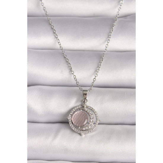 Mey İthalat® 316L Çelik Gümüş Renk Zirkon Taşlı Pembe Sedefli Hilal Model Kadın Kolye