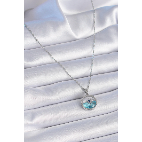 Mey İthalat® 316L Çelik Zincir Gümüş Renk Zirkon Taşlı Deniz Görünüm Kutup Yıldızı Kolye