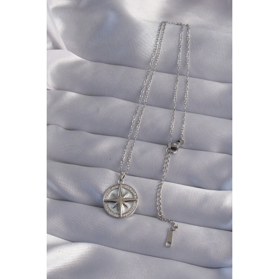 Mey İthalat® 316L Çelik Zincir Gümüş Renk Zirkon Taşlı Kutup Yıldızı Kolye