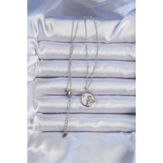 Mey İthalat® 316L Çelik Zincir Gümüş Renk Zirkon Taşlı Mineli Melek Kolye