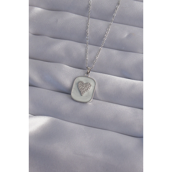 Mey İthalat® 316L Çelik Zincir Mermer Desenli Gümüş Renk Zirkon Taşlı Kalp Model Kolye