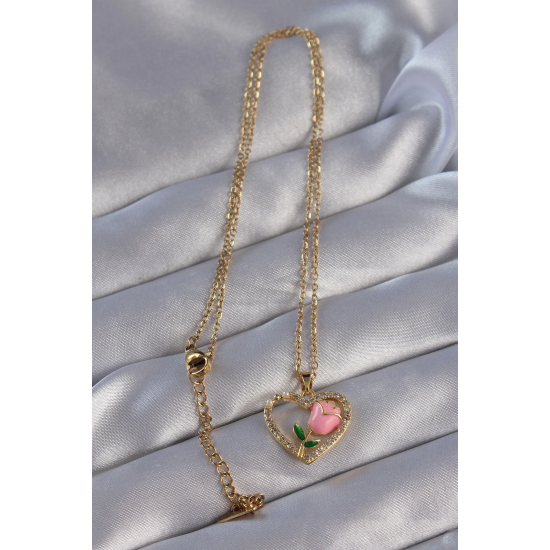 Mey İthalat® 316L Çelik Zincirli Gold Renk Zirkon Taşlı Kalp İçinde Pembe Gül Tasarımlı Kolye