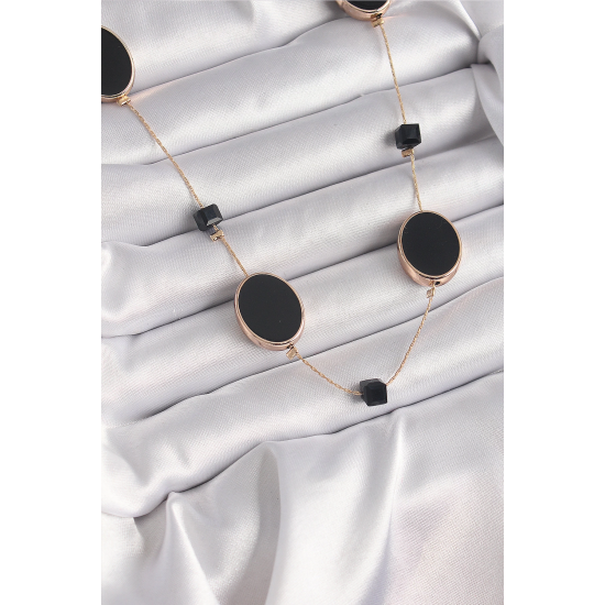 Mey İthalat® Pirinç Gold Renk Siyah Renk Oval Siyah Küp Detay Kadın Kolye