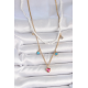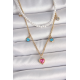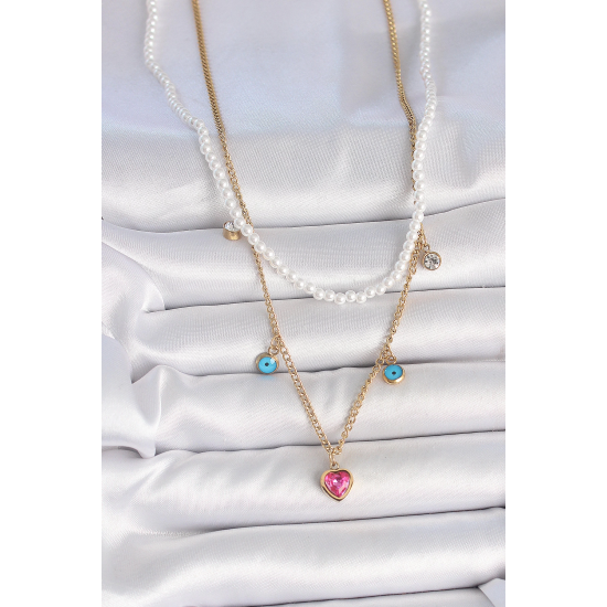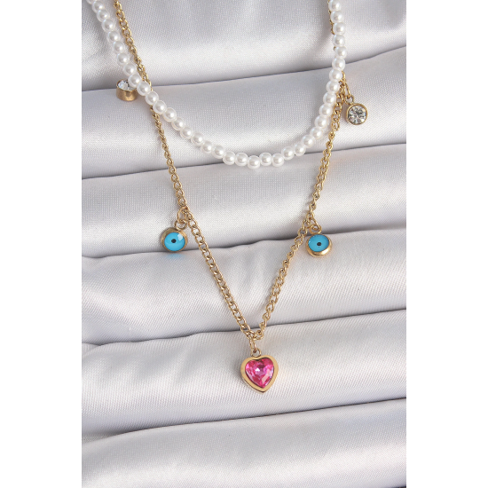 Mey İthalat® 316L Çelik Gold Renk 2'Li İnci Zincir Model Pembe Taşlı Kalp Figür Nazar Boncuk Detay Kadın Kolye
