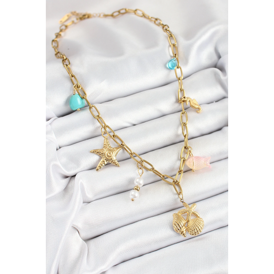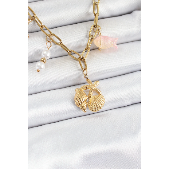 Mey İthalat® 316L Çelik Gold Renk Deniz Yıldızı ve Deniz Kabuğu Konsept Kadın Kolye
