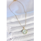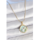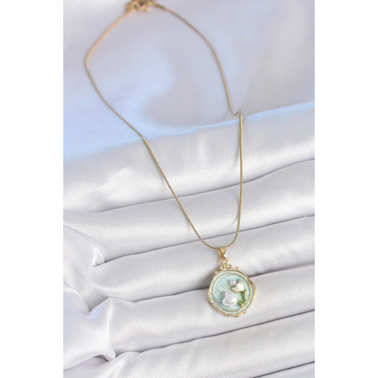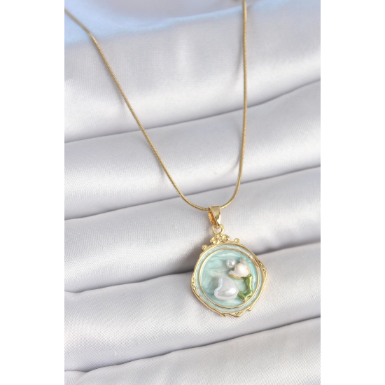 Mey İthalat® 316L Çelik Gold Renk Zincir Turkuaz Mineli İncili Çiçek İşlemeli Portre Model Kadın Kolye