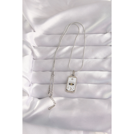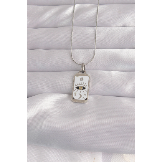 Mey İthalat® 316L Çelik Gümüş Renk Beyaz Mineli Göz Figür Tarot Kolye
