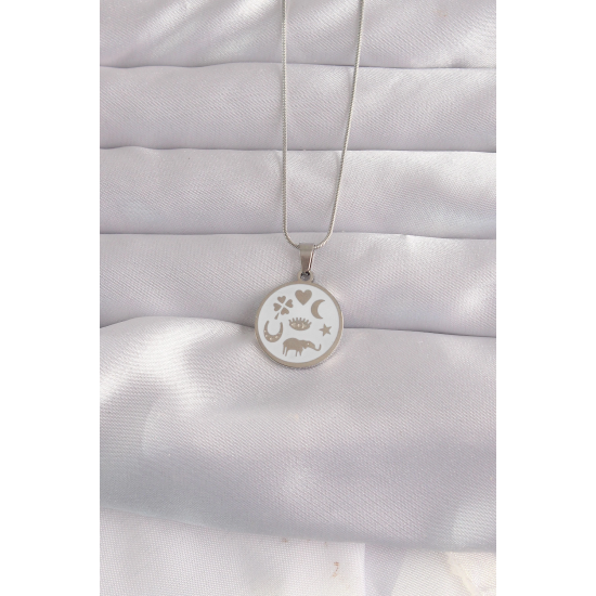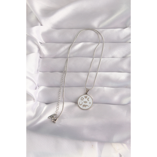 Mey İthalat® 316L Çelik Gümüş Renk Beyaz Mineli Karışık Figürlü Tarot Kolye