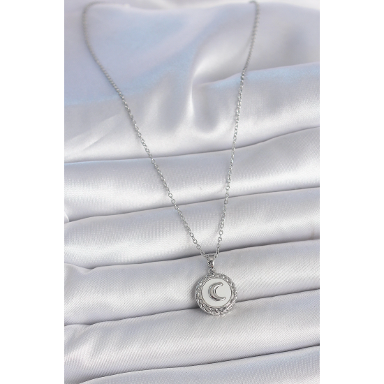 Mey İthalat® 316L Çelik Gümüş Renk Zincir Beyaz Mineli Hilal İşlemeli Madalyon Model Kadın Kolye