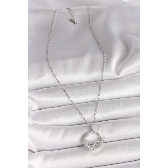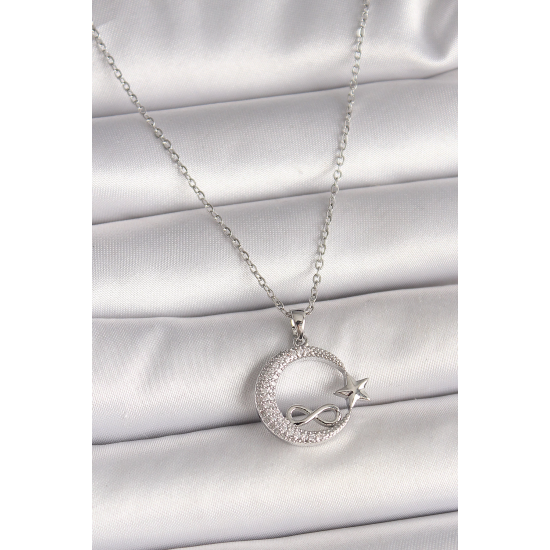 Mey İthalat® 316L Çelik Gümüş Renk Zincir Zirkon Taşlı Ay Yıldız Model Sonsuzluk Detay Kadın Kolye