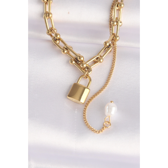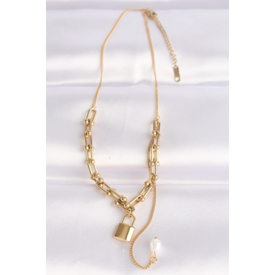 Mey İthalat® 316L Çelik Zincir Altın Renk Zincirli Love Yazılı Kilit Kolye
